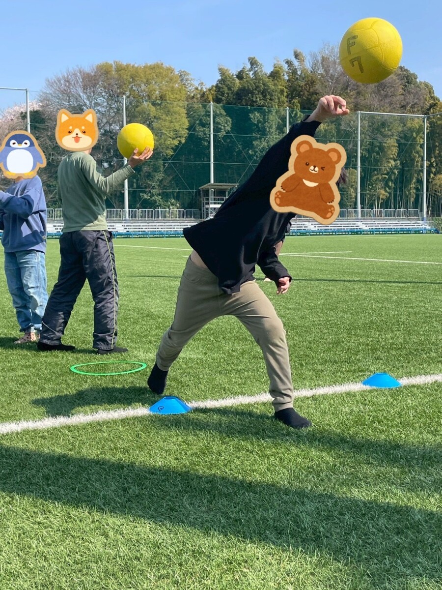 高学年になると体育などでボール運動が取り入れられてきますが、ボールを投げることが苦手な子どもも多く、身体を捻る動作を意識させて練習に取り組んでもらいました。途中からは、ボールを手で扱うことよりも難度があがる足でボールを扱うことにも挑戦してもらいました。要するにサッカーにおけるドリブル動作です。
