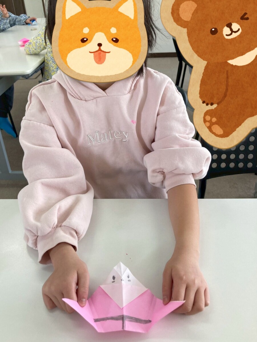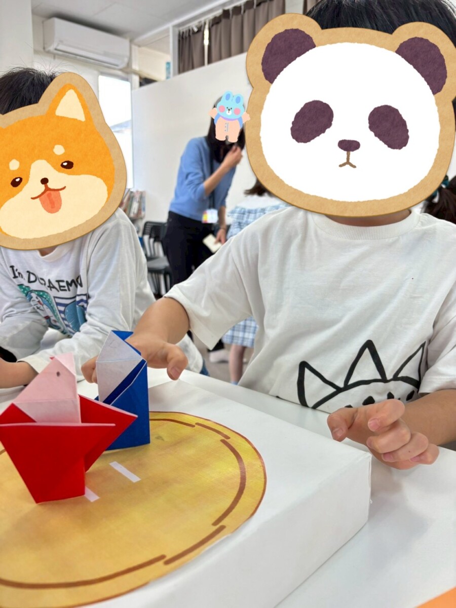 午後はいよいよ紙相撲大会です。机ごとにグループになり、「トントン!」と土俵の箱を指で叩いて勝負を行いました。力加減が難しく、最初は力を入れすぎてしまう様子もありましたが、回数を重ねるごとにコツをつかみ、上手に力を調整できるようになっていきました。