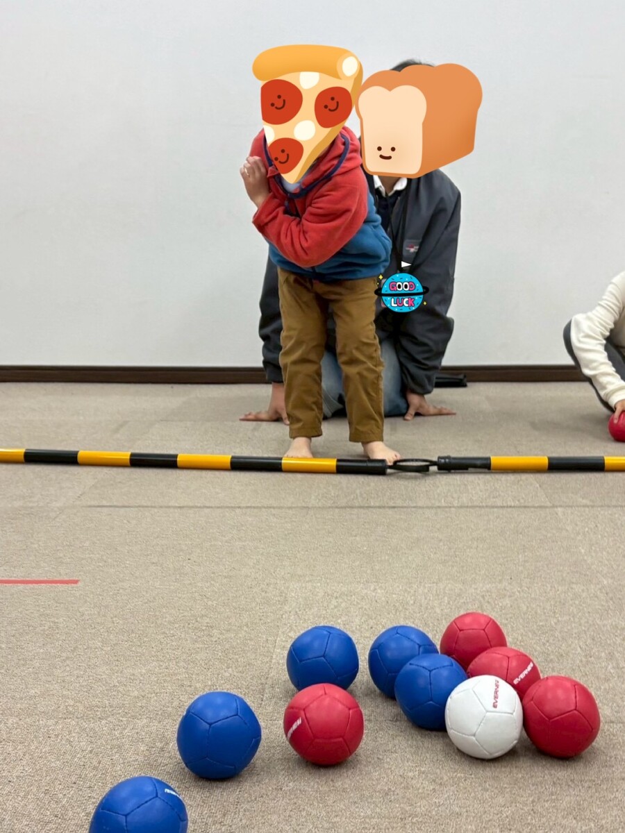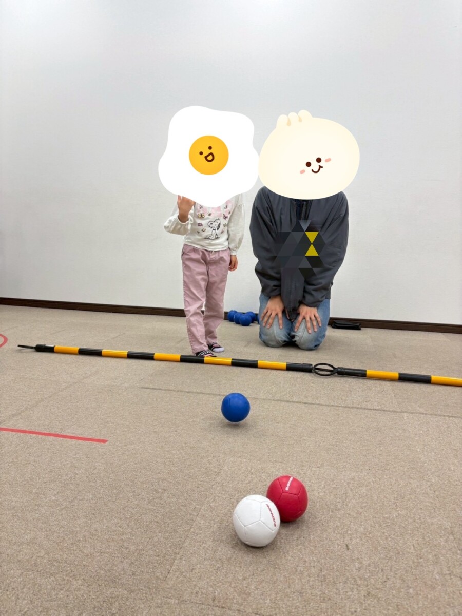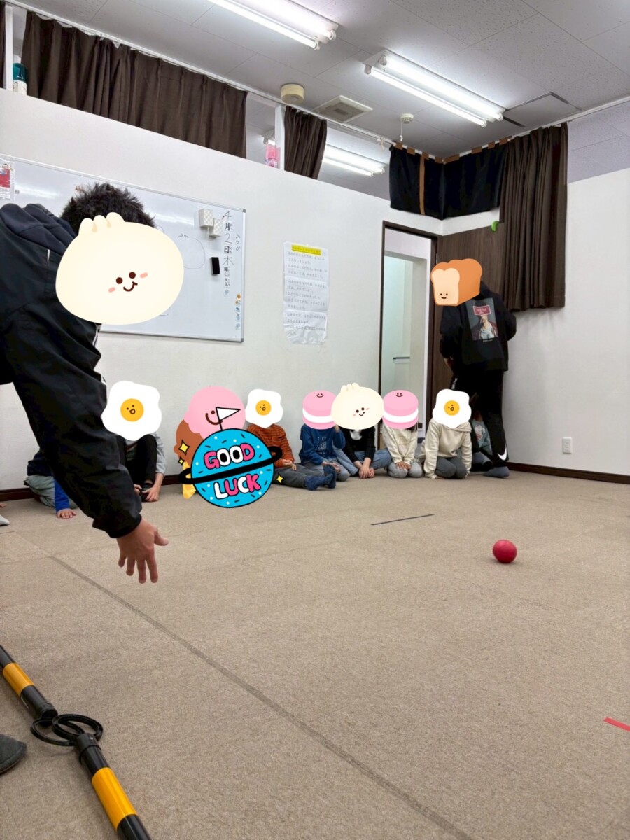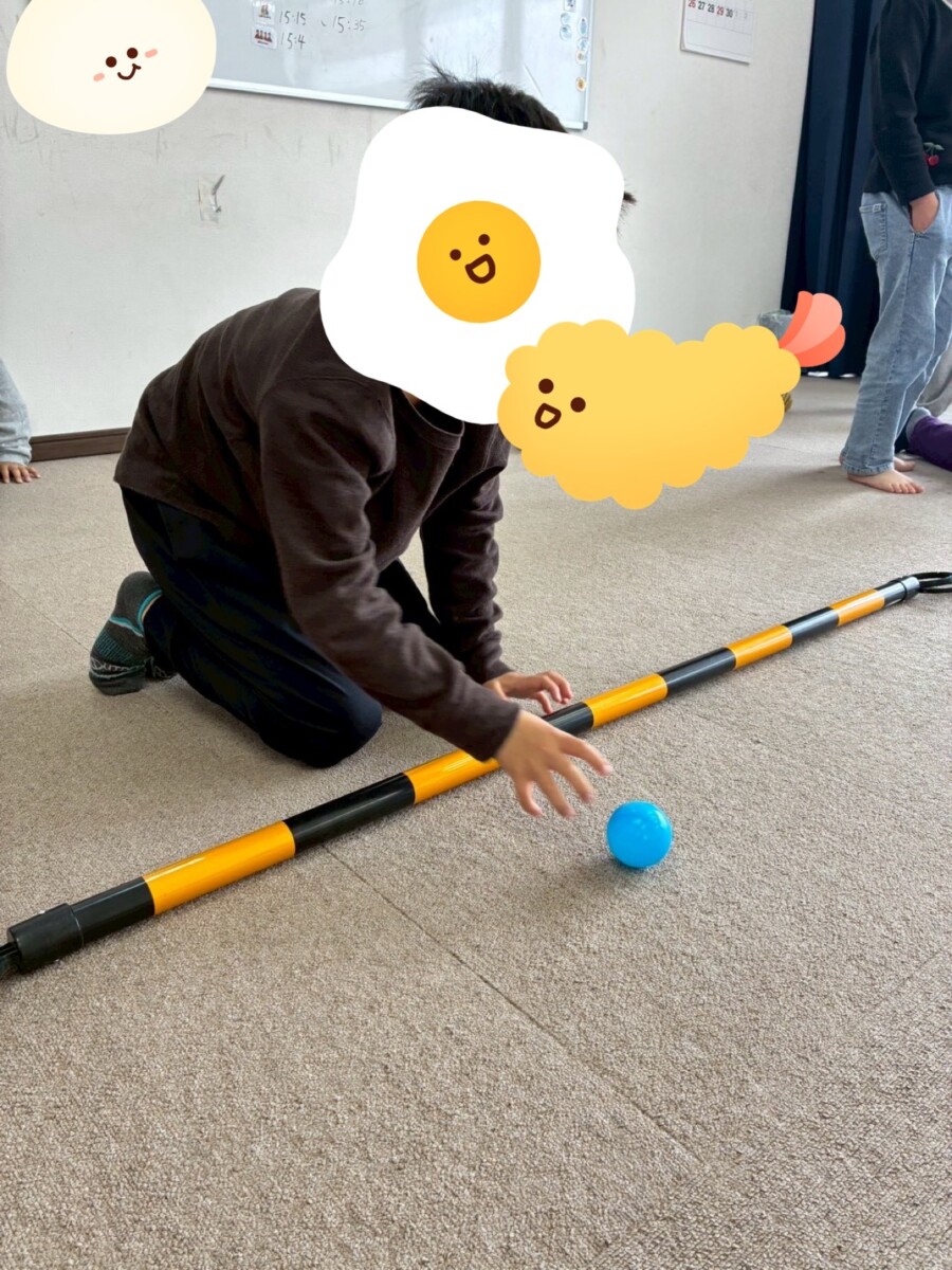 子どもたちの様子を見ていたのですが、前は子どもたちはとんでもない方向や強さでボールを投げたり転がしたりしていたのですが、今回はやってみるとコツをつかんでいる子どもが多く、目標物(白玉)に近づけるための工夫をすることができていました。