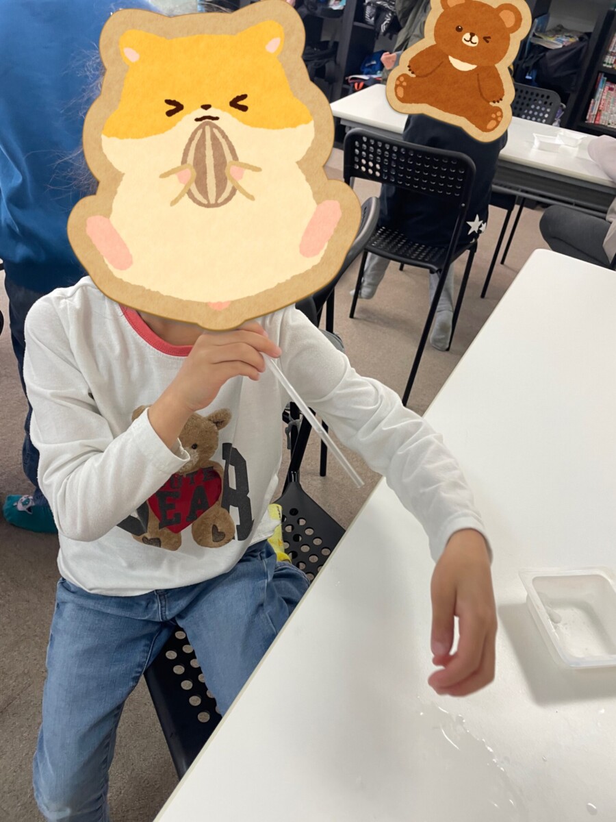 今日利用してくれたのは、割と運動系が好きな活発系の子どもたちなので、座ってやるプログラムは苦手かなと思いながら様子をみていましたが、みんな着席して実験に取り組めていました。
