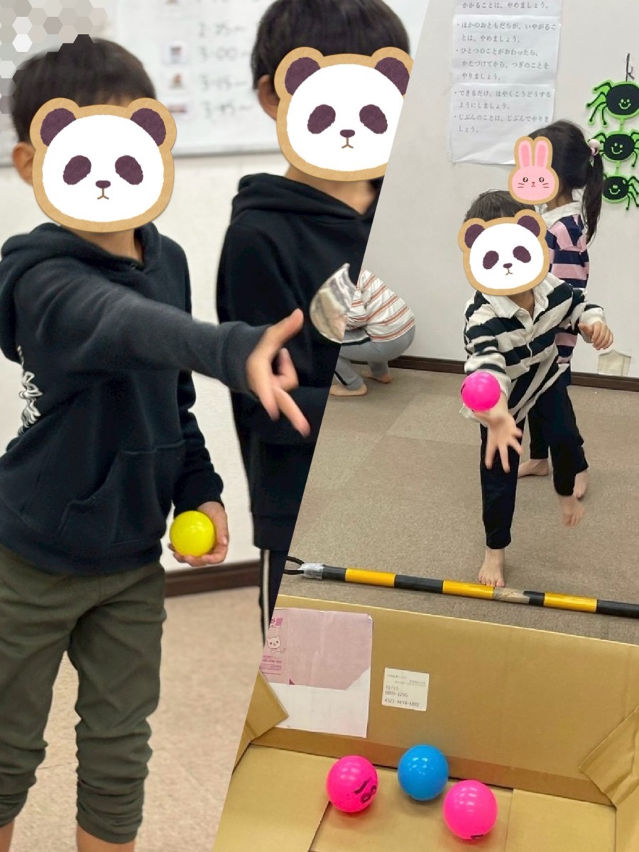 本日、行った療育は、「玉入れ」です。目的としては、物との距離をみて、力加減などを考えて投げる練習です。