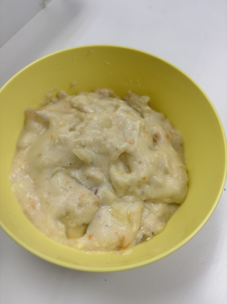 このシチュー、子どもの好き嫌いをなくしてもらうため、いろいろ工夫されていたようで野菜の原型がほぼなくなるまで煮込んでいるようです。それでもニンジン嫌いの子は、オレンジ色の小さな塊を見つけ、「これ何?」と聞いてきたので、正直に「ニンジンだよ」と答えると、「これは小さいから頑張って食べてみる」とチャレンジしていました。