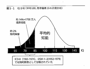 グラフにも示しているように、IQ値の分布は正規分布に従うとされ、平均が100、標準偏差が15と定義されており、IQ70~84が境界知能域となり、全体の約14%を占めると考えられています。ちなみにIQ69以下の場合は知的障害(軽度・中等度・重度)とみなされ、全体の約2%を占めていると考えられています。すなわち、境界知能は定型域と軽度知的障害の間に位置すると考えられています。