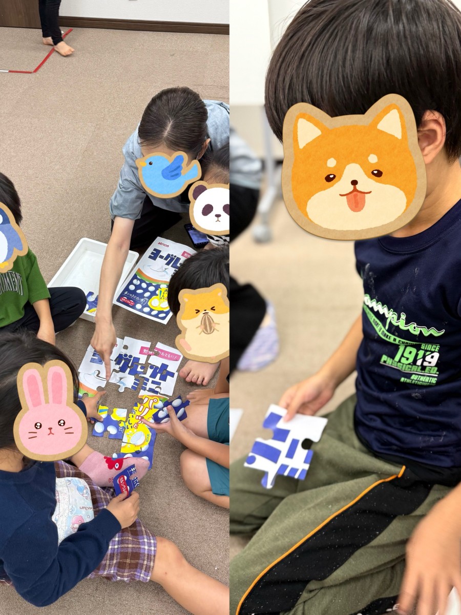 A教室では絵本の表紙をパズルにしたもの(20ピース)、B教室ではお菓子のパッケージをパズルにしたもの(15ピース)に取り組んでもらいました!