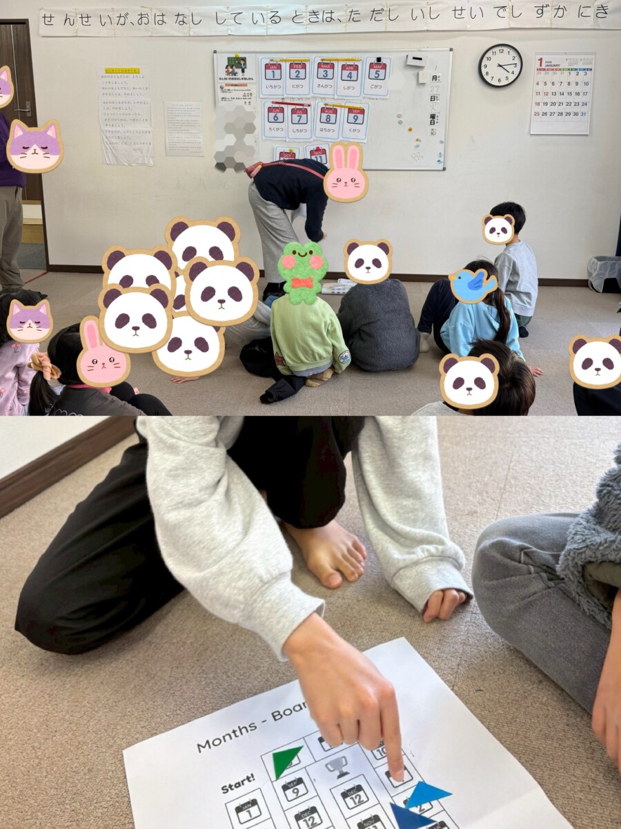 ゲームの前に、1月~12月の言い方の練習を。何度か繰り返します。少し長めの言い方の月(1月、2月、9月、11月、12月)は、少しテンションが下がりますが、テンポよく、を意識しています。
