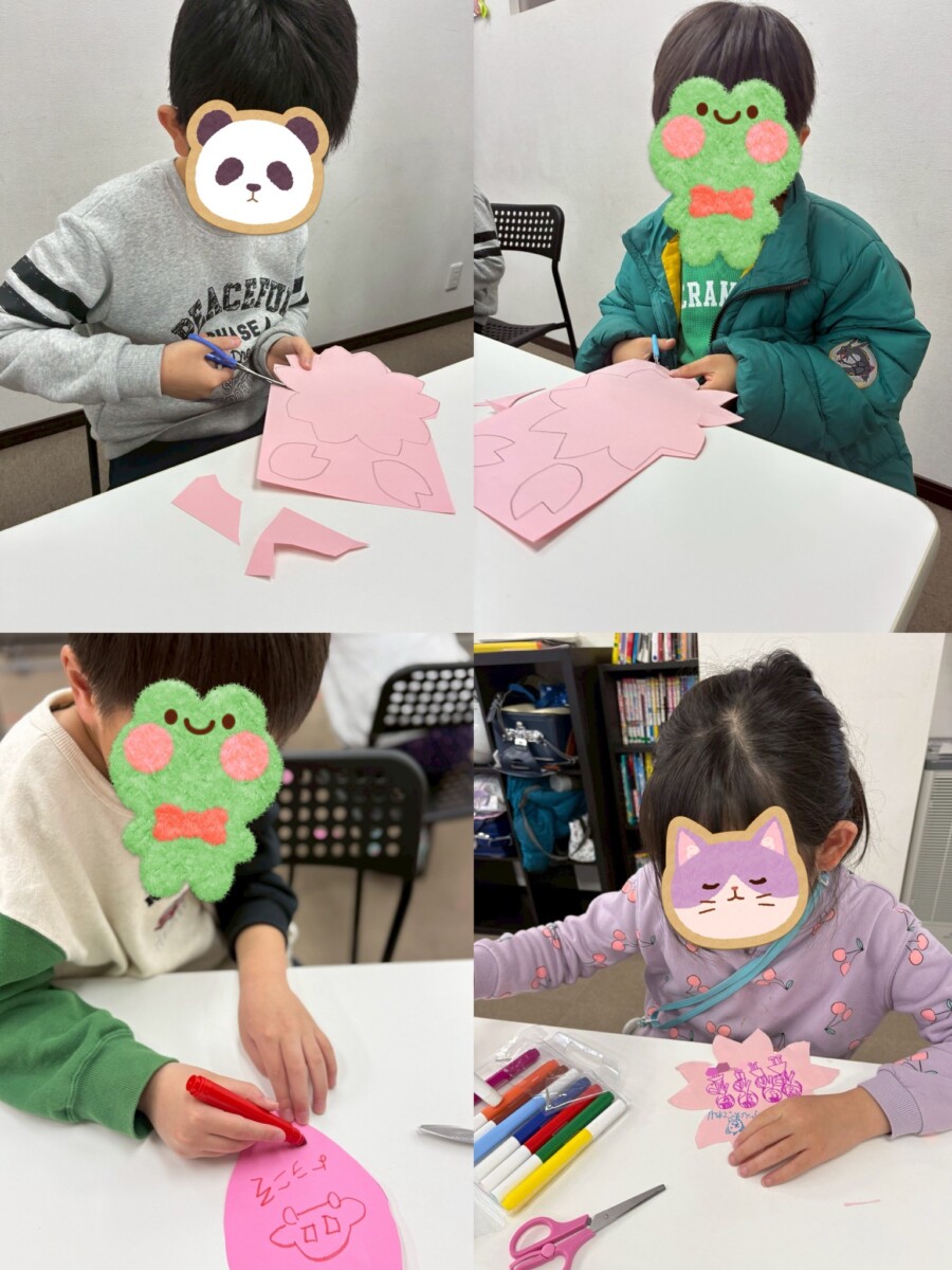 はさみの作業が終わったお友達は、切った桜のカードにメッセージを書いていきます。
