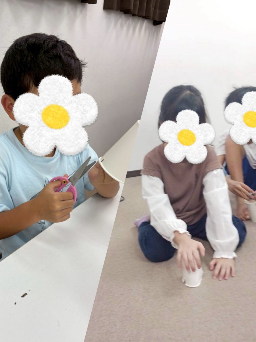 ・紙コップに切り込みを入れる、輪ゴムを貼る、キャップをねじるなどの工程を通して、手指の巧緻性を養う。