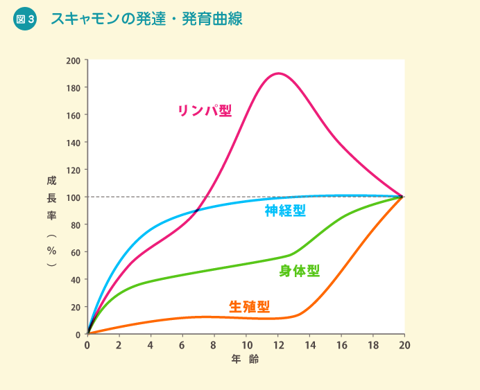 スキャモンの発達曲線とは、子どもが成長していく中、器官や機能はそれぞれ個々に発達していくとされており、1つの事柄においても吸収しやすい時期としにくい時期があるとされています。その時期を曲線で示したものを「スキャモンの発達・発育曲線」というのです。