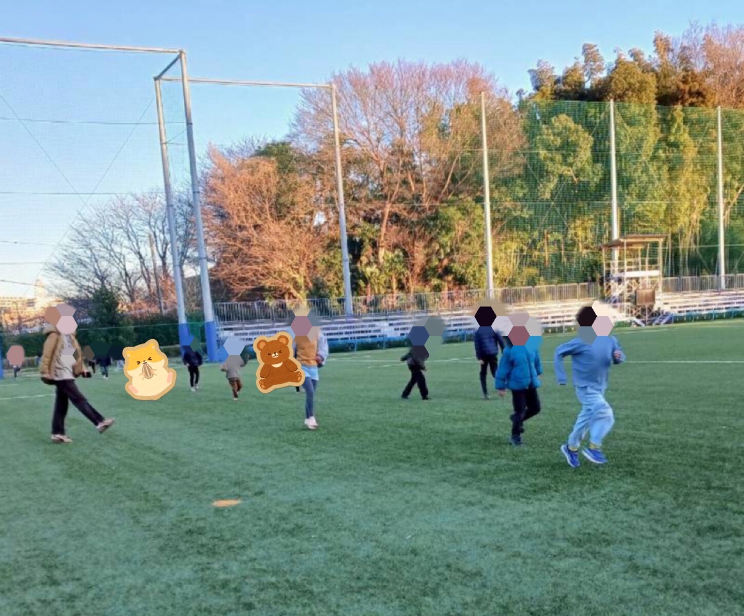 活動の最後は、みんながお待ちかねの鬼ごっこをしています。鬼がどこにいるかをよく見て逃げることで視野を広く持ったり、練習したサイドステップで逃げるなどの様々な動きを行いました。
