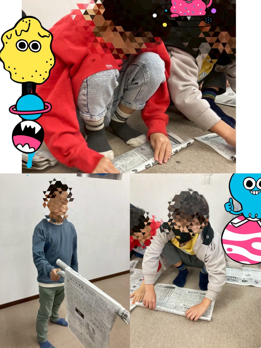 新聞紙を細長く均等に棒状に丸めるためにはどうしたらいいか思考しながら、細かく指先を使う事で手指の巧緻性を養いました。