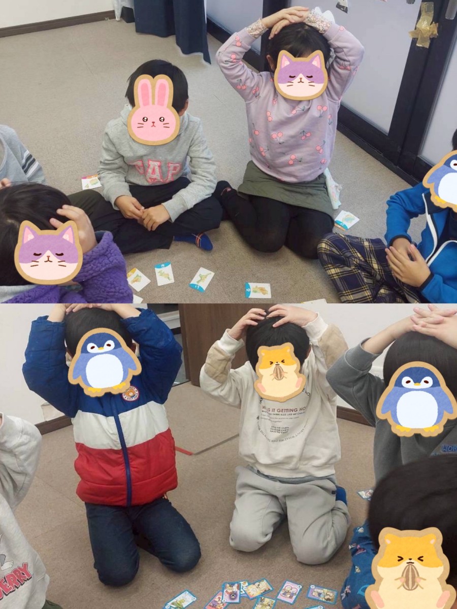 「手は頭につける」「手が同時に重なったらじゃんけんをする」「負けても怒らないで気持ちを切り替える」という活動のルールを確認した後、グループに分かれてカルタをしました。気持ちの切り替えを促す活動や勝ち負けのある活動を繰り返し行うことで、初めは気持ちが崩れてしまう事が多かった子も、スムーズに活動をすることが出来ました。みんながきちんとルールを守って活動をすることの大切さを学んだと思います。