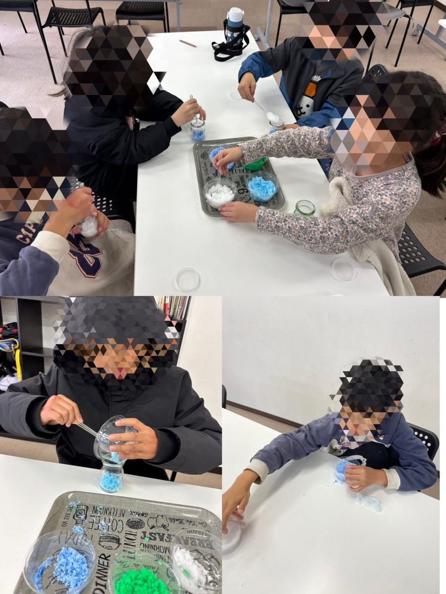 インスタントスノーは不思議な感触で、色を付けたり、遊び終わったらスライムやスノーアートにして使うことが出来るので、ぜひご家庭でも使ってみてください。