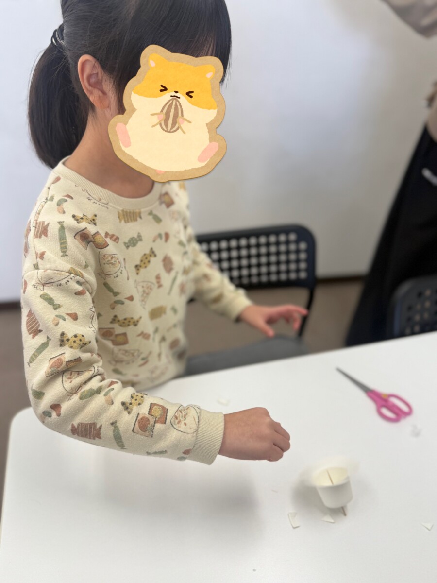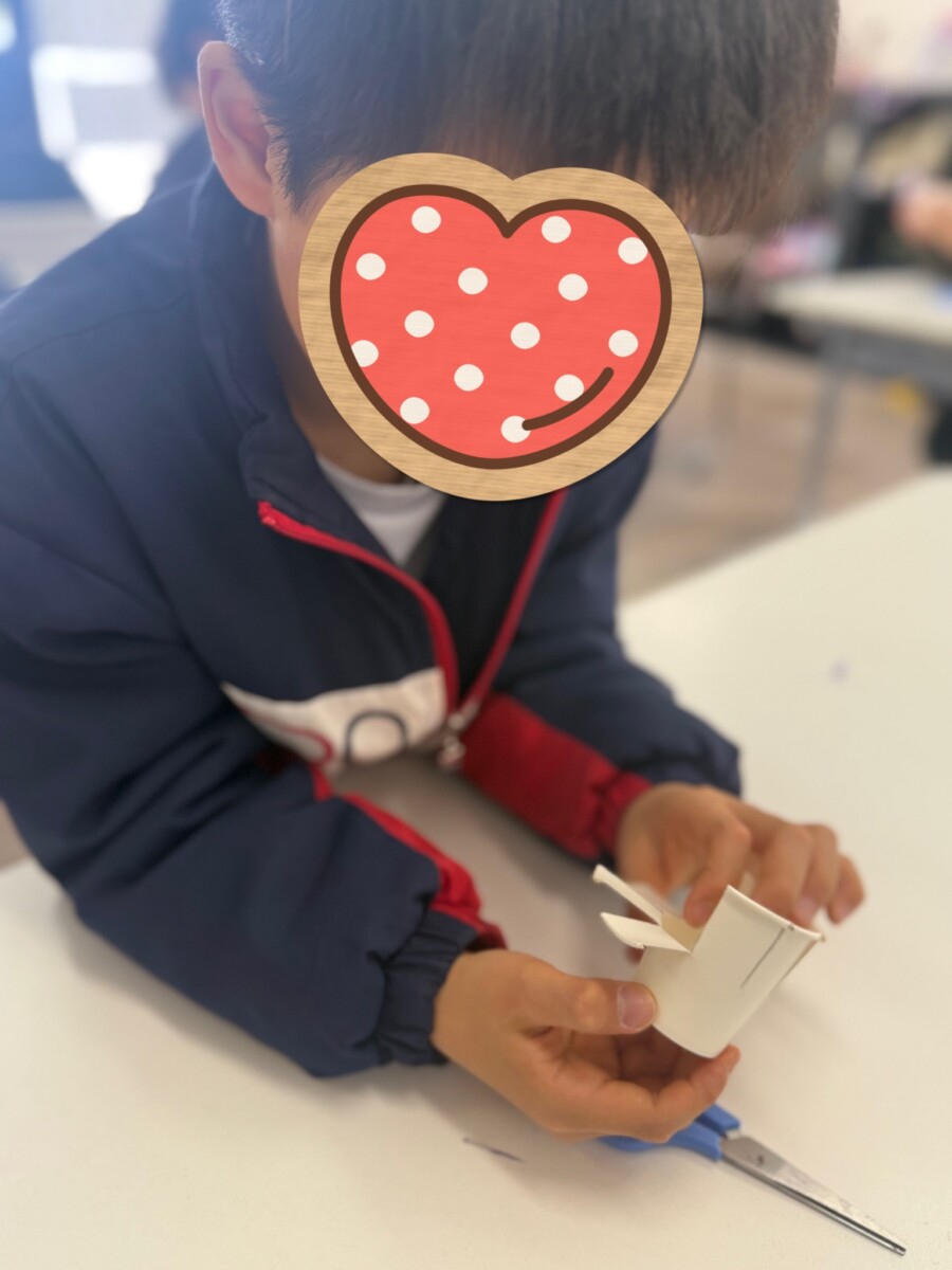 また、私は切り込みを外に向けて折ることが当然だと考えていましたが、切り込みを内側に折る子もおり、それぞれの工夫が見られました。