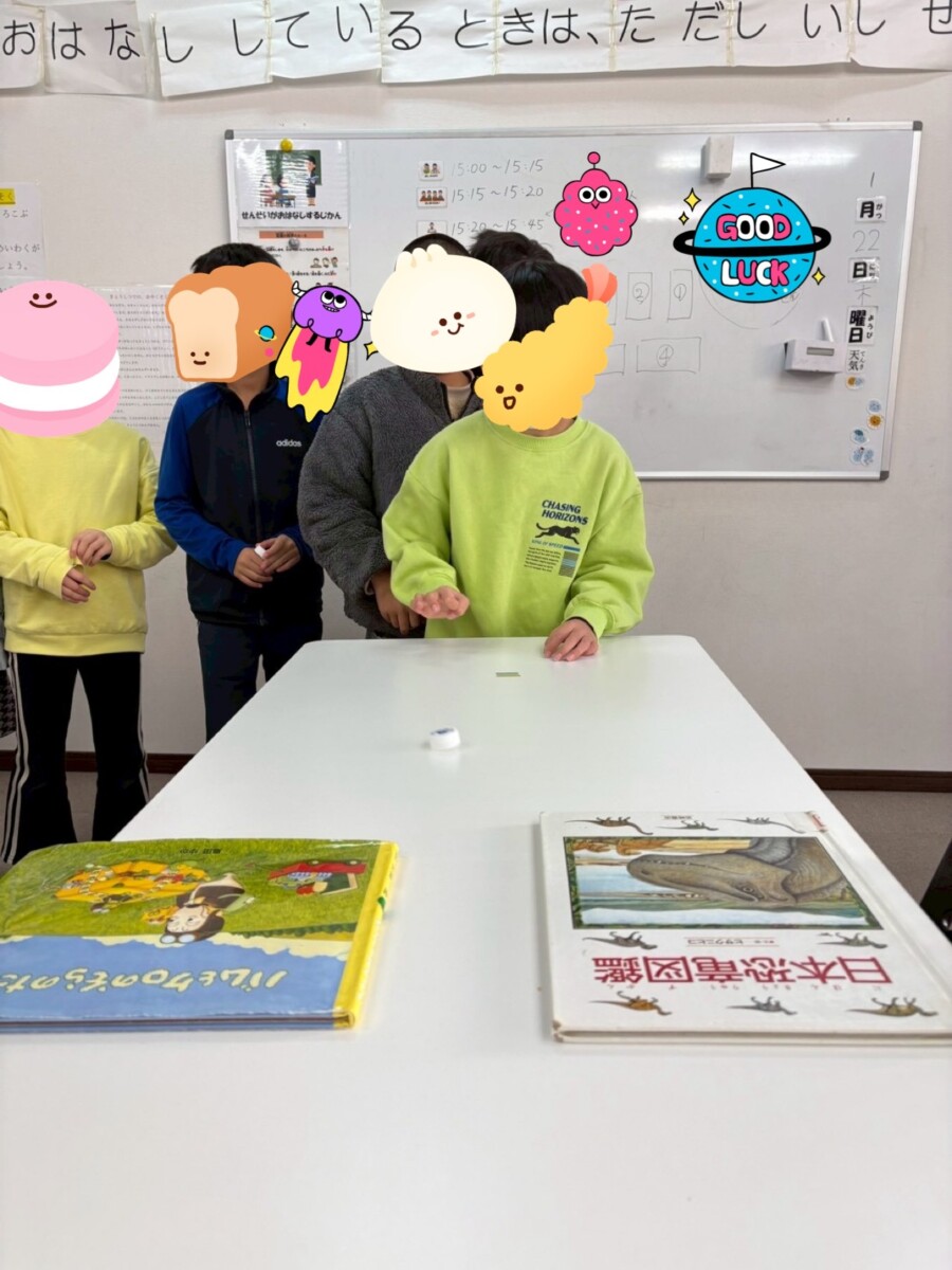 本日は机に本を並べ、キャップをはじいて本の間を通すという活動でした。
