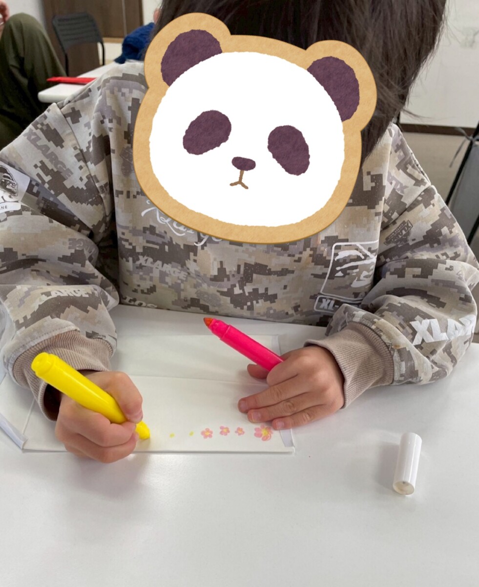 午後には羽子板に自分の好きな物を書いて表現をしたり、シールを貼りデコレーションをしました。