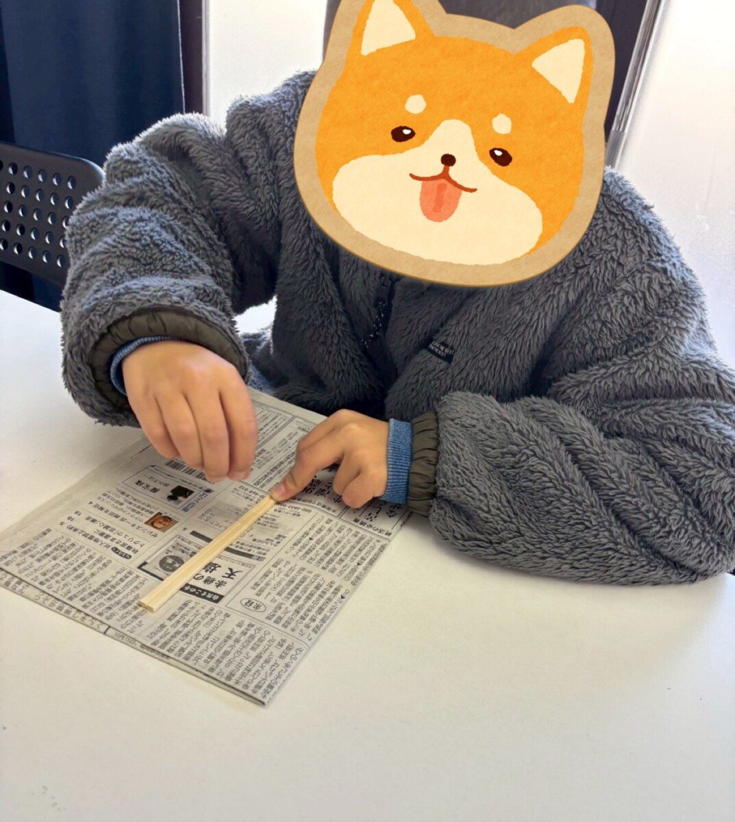 割りばしを中心に新聞紙を丸める時には両端をしっかりと持ち、バランスよく丸めることを伝えました。