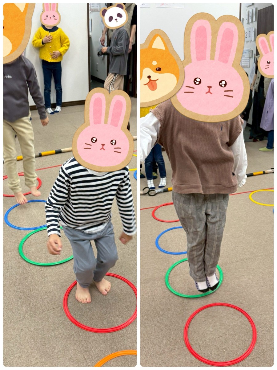 初めはリズムよくジャンプ出来ていても後半になるとリズムが分からなくなり、テンポが速くなる子どもも数名いましたが、繰り返し取り組むと、ほとんどのお子様がリズムよくジャンプすることが出来ました。