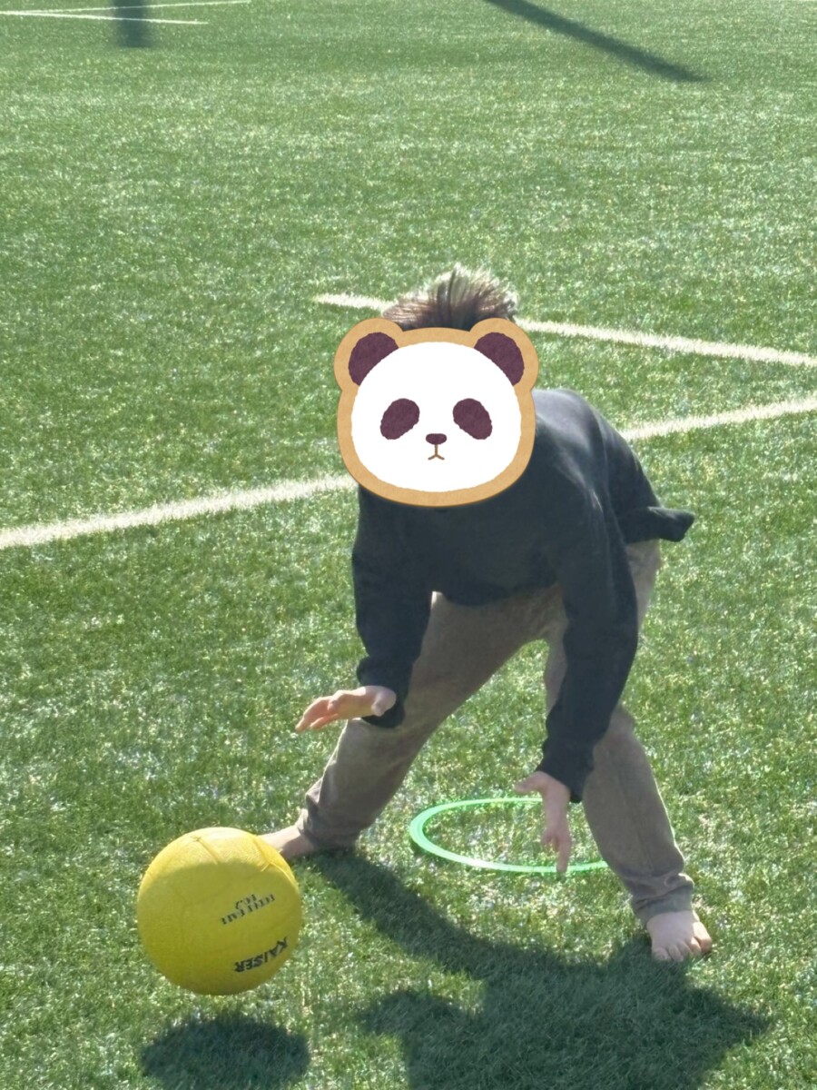 以前からグラウンドでは周りをよく見て動く鬼ごっこや、ボールを真っすぐ転がす活動を行ってきました。そこで今回はその両方の力が必要になる「トリカゴ」の活動をしています。