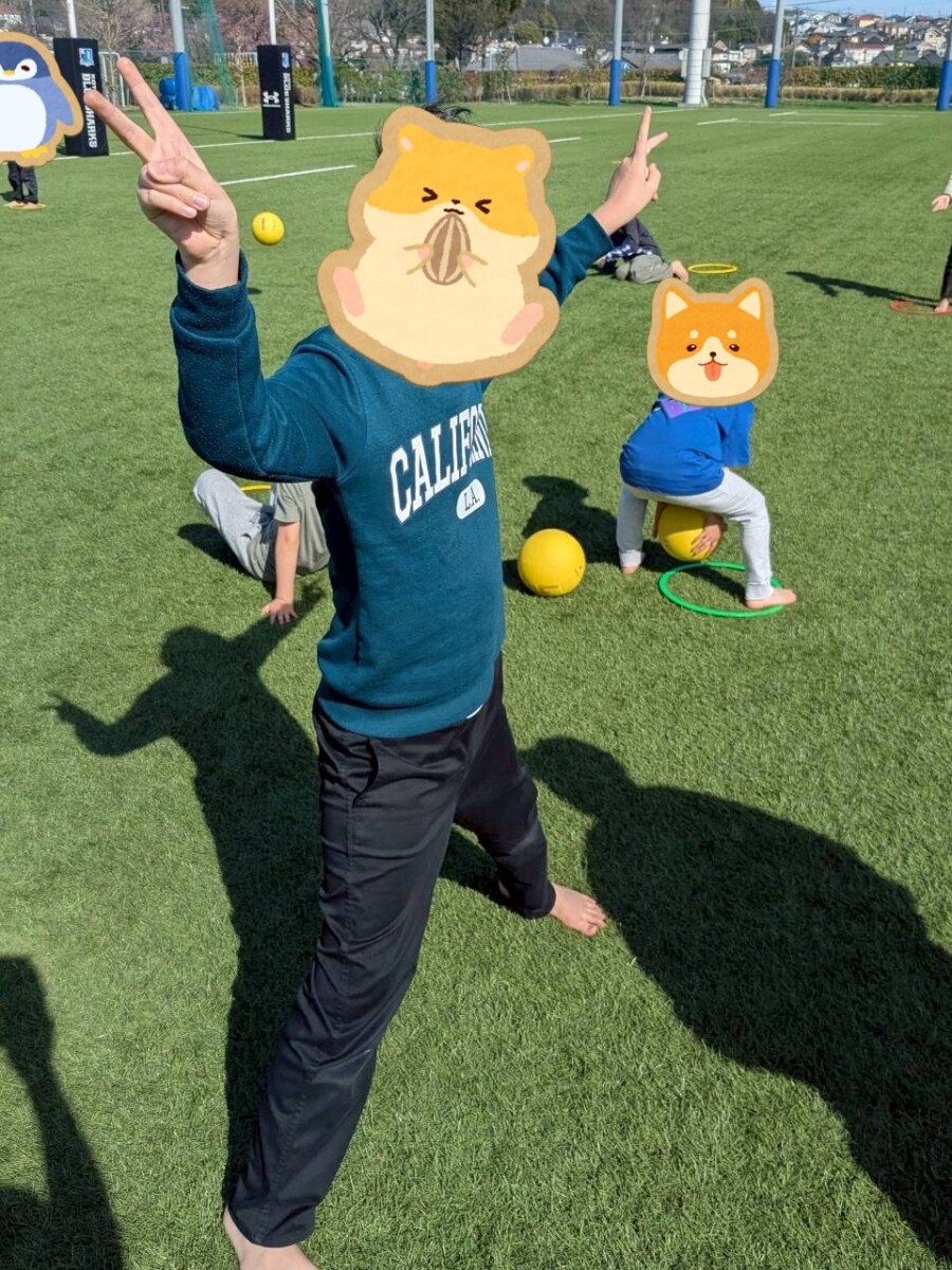 発展として、パス回しの範囲を広げると同時に鬼役に立ってボールを追いかけてもらっています。ゾンビのように追いかける鬼がおり、面白かったです。パスをする子の中には、鬼が近づいてくると焦ってしまう子が見られましたが、職員が入ることでスムーズにボールが回るようになりました。