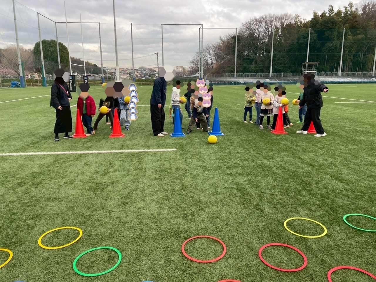 広々としたプロ用の人工芝グラウンドで運動療育を行いました。