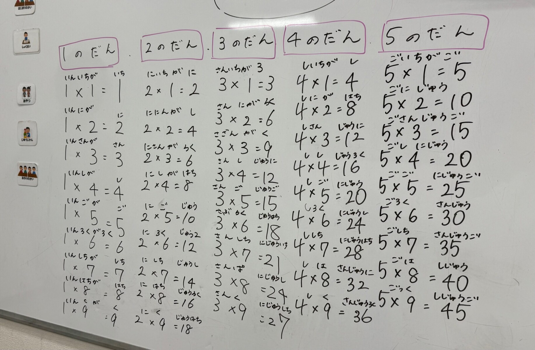 まず初めに掛け算の言い方(いんいちがいち)等の読み方を確認した後に音楽を聴きました。