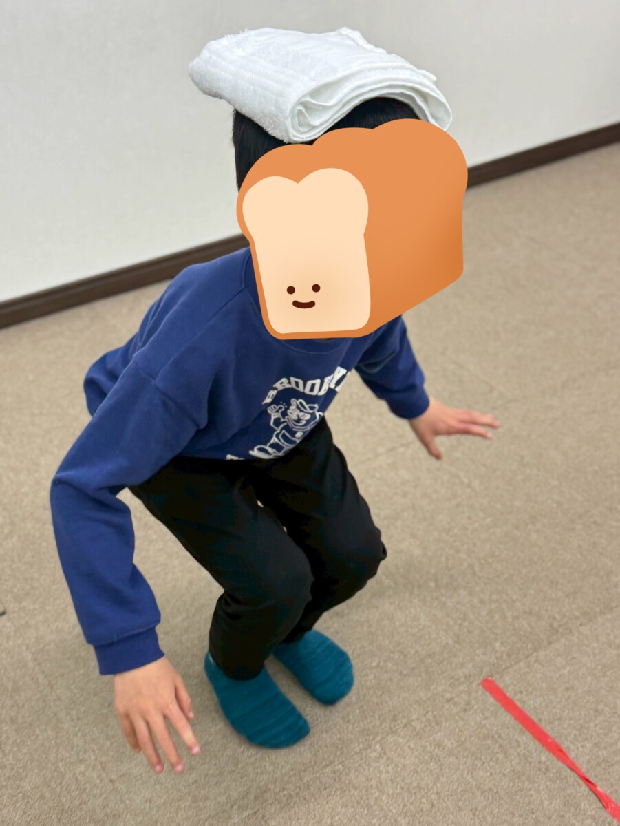 最後はタオルを頭に乗せて座ったり、立ったりするバランスゲームです。