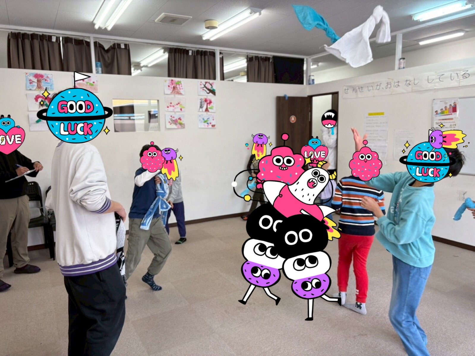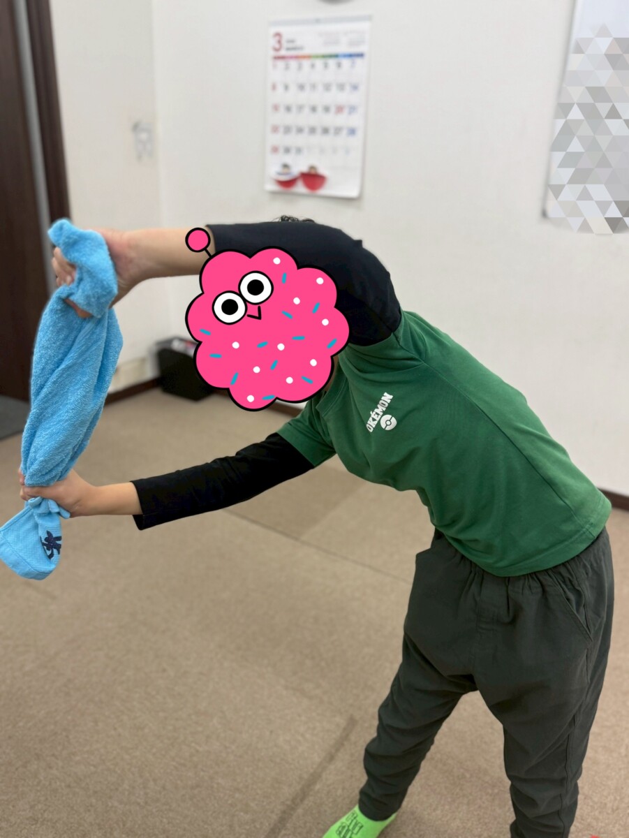 その次はタオルをほどき空中に投げ頭でキャッチするというチャレンジです。空間認識能力やボディイメージを養うことを目的としております。