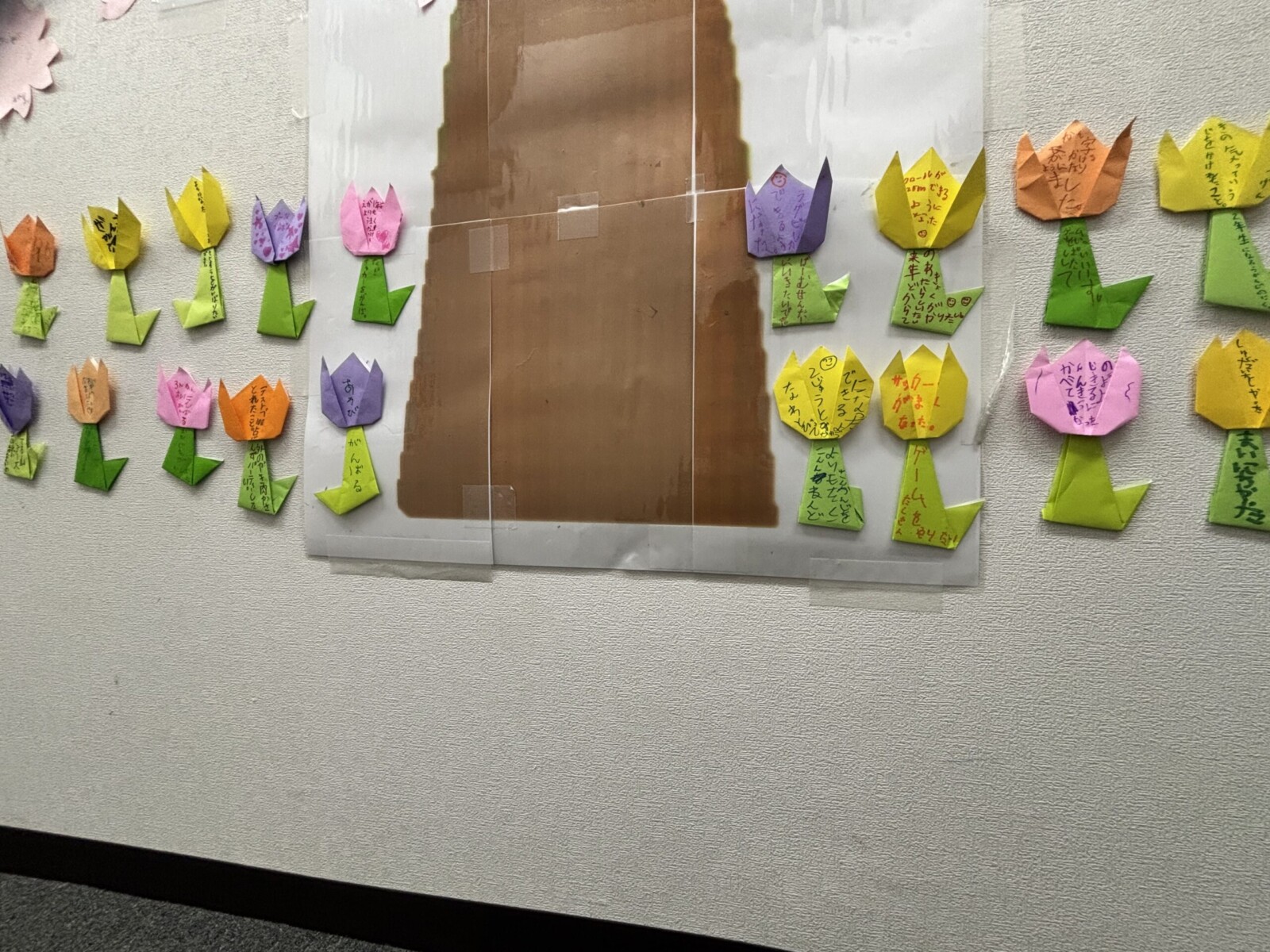 今回は、折り紙でチューリップを作り、その中に「今年頑張ったこと」と「4月から頑張りたいこと」を書く活動を行いました。