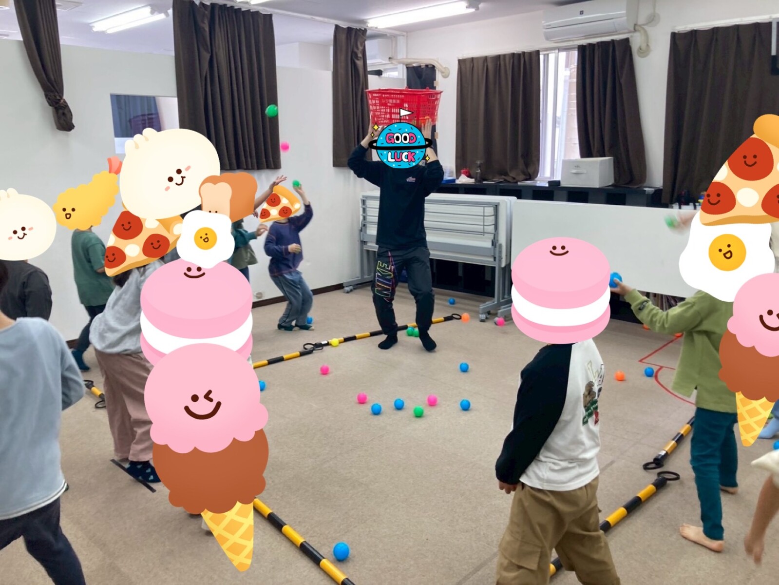 後半では、職員扮する「カゴマン」が登場しました。このカゴマンは教室を動き回って逃げます。みんなは逃げるカゴマンを追いかけてカゴの中にボールを投げ入れるのです。