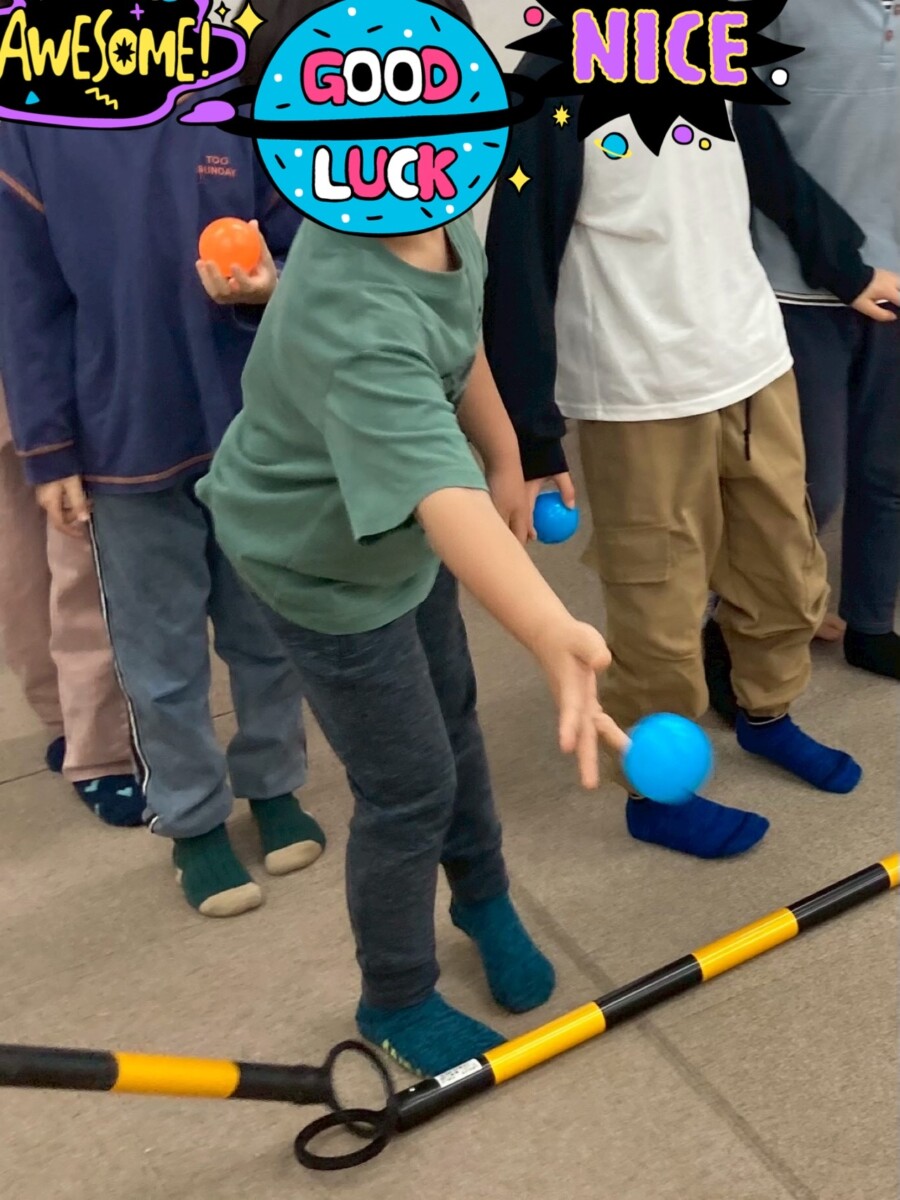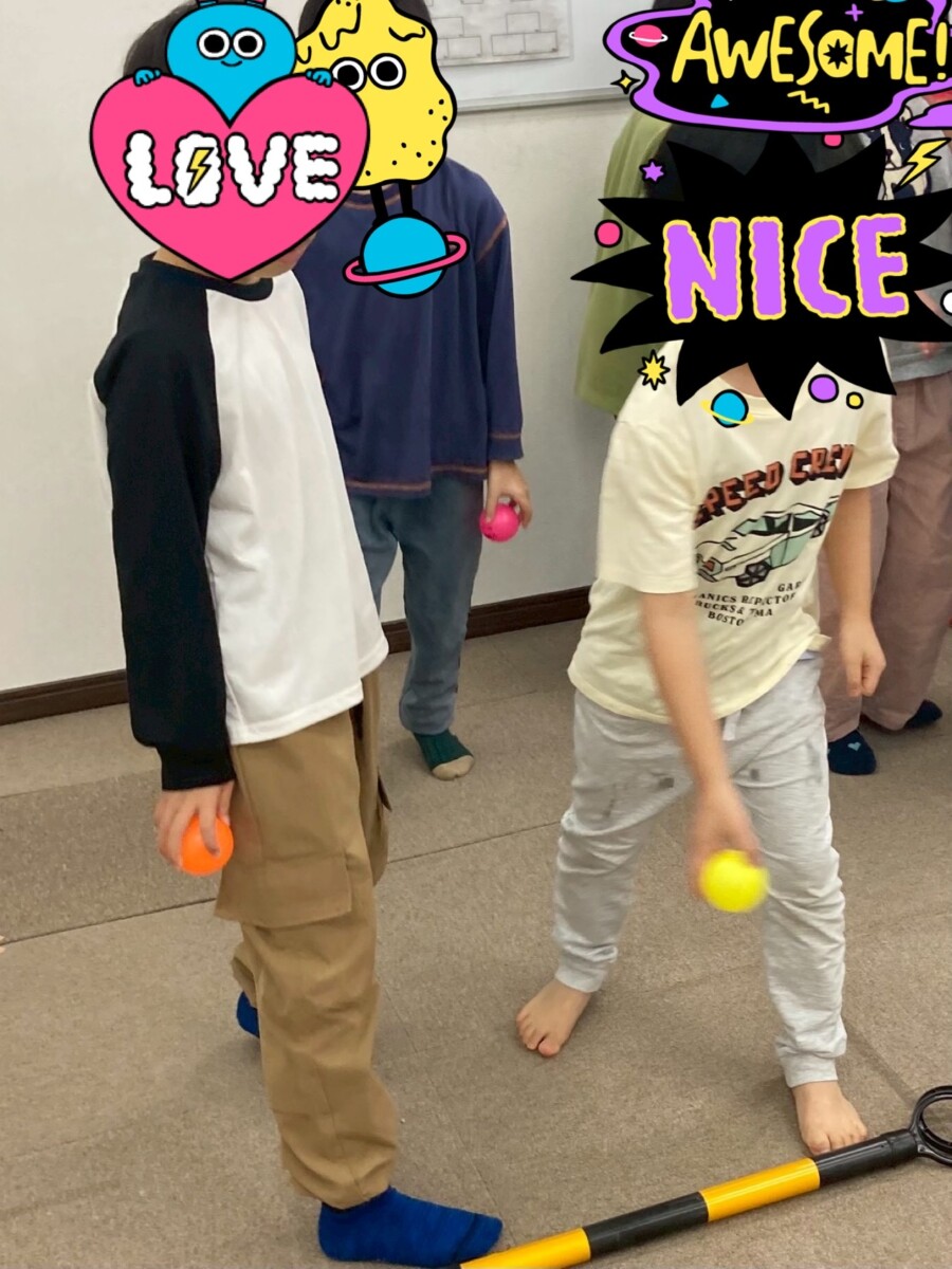 みんなが簡単そうにボールを投げ入れるので、途中から椅子をもっと遠くに置いて難易度を上げています。難しくなっても気持ちが乱れたりせず最後まで楽しく参加することができました。