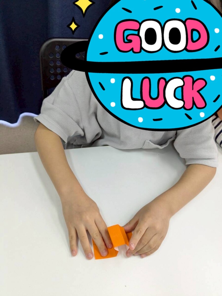 紙を折る際の山折りと谷折りを覚えてもらう事、折り紙をきれいに折る手先の器用さを養う事、あおむしを進める際に息を吹く力加減を養うことを目的としております。