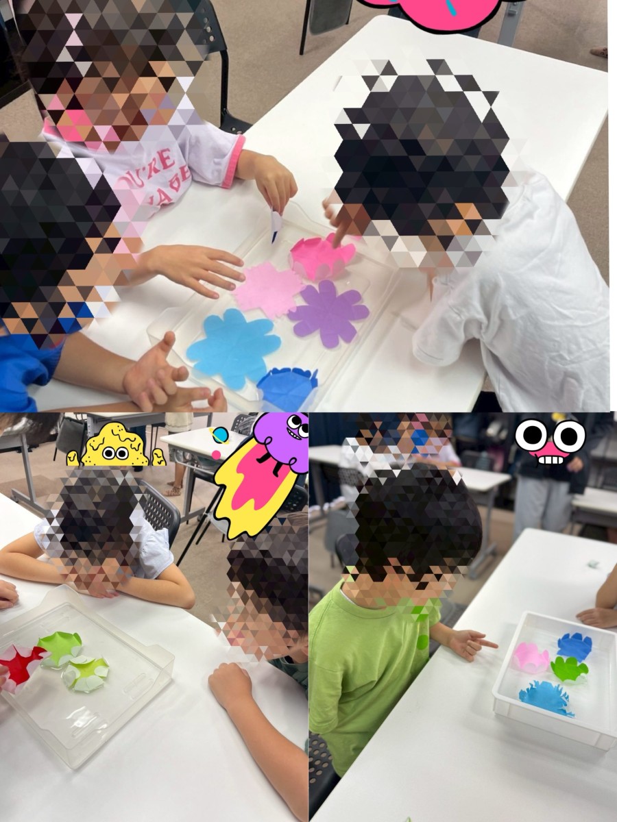 午前中は、実験の準備から行いました。折り紙を折り、切り絵のように花を作ります。
