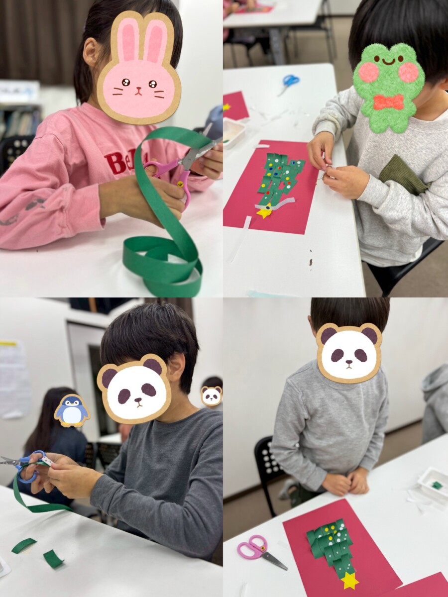 ・同じ長さに紙テープを切り、全体のバランスをとりながらツリーの形を作り空間認知能力を高める