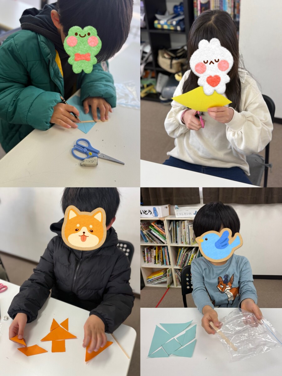 最後は自分で作ったタングラムを使い、難易度別に、『木の形』や『ダイヤモンドの形』『人の形』など問題にチャレンジして楽しみました。