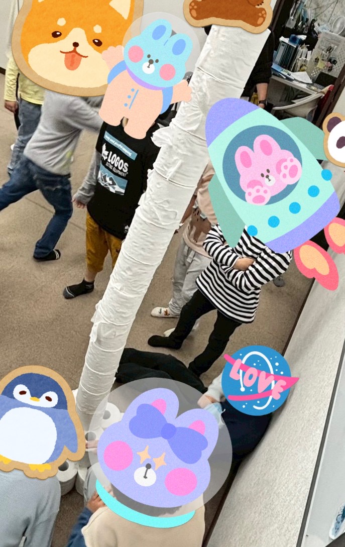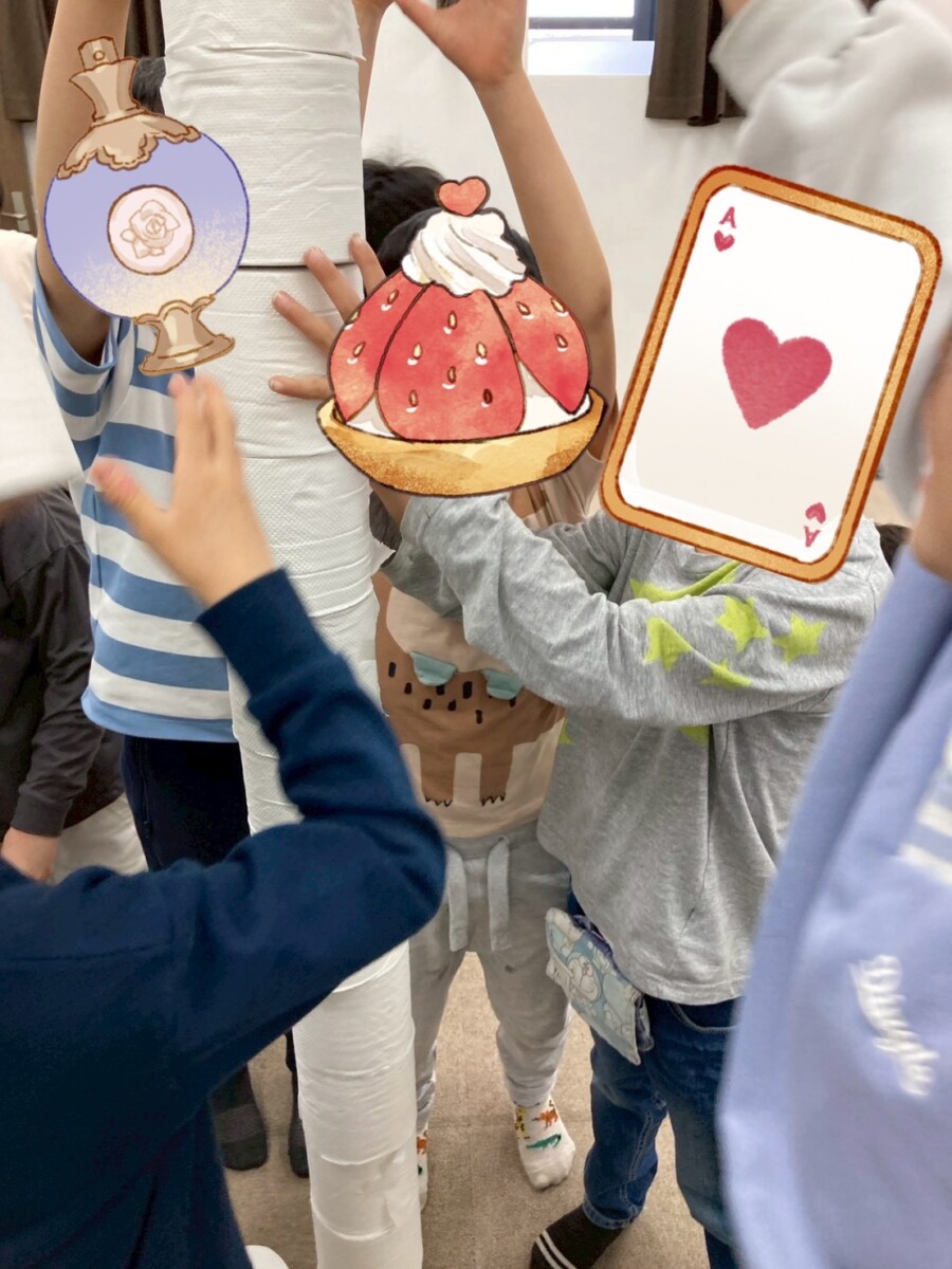 子どもたちの中には、「ここを押さえていて」「土台を作ろう」と声をかけながらやるグループや、工夫を凝らして椅子を使って自分の身長より高く積めていたグループもあり、自分たちで役割分担もきっちりできている様子を見て「こんなにできるんだ」と普通に驚いてしまいました。